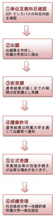 履修を許可された学生は、科目提供大学における「単位互換履修生」(特別聴講学生)となります。